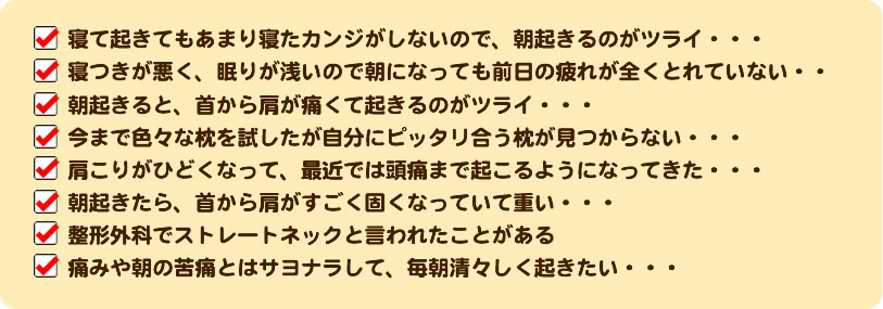 あなたに合った枕を作ることで、「朝起きた時に、あまり寝た感じがしない・・・」と言ったツライ悩みを解消することができます。それにより、あなたは心ゆくまでぐっすりと安眠することができるようになるでしょう。 そして、朝には昨日の仕事の疲れがとれ、今までにはないスッキリとした朝を迎えることができるでしょう。