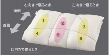 当店のオーダーメイド枕は仰向き・横向き寝に対応した高さに作り、中身のかたまりをなくし、形状を保ちやすくするために、生地を6分割に分け、中身を入れています。