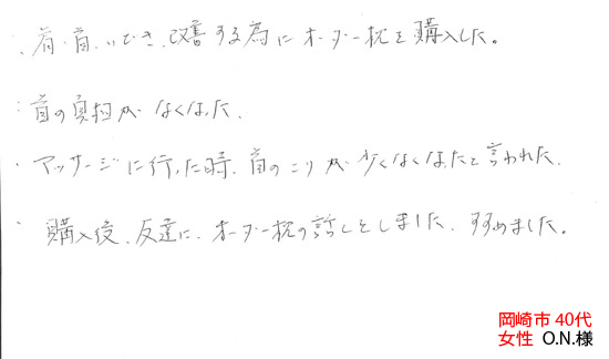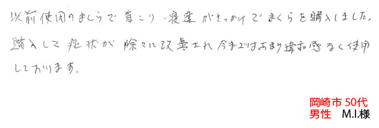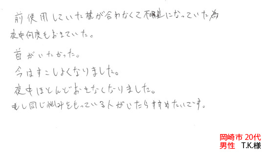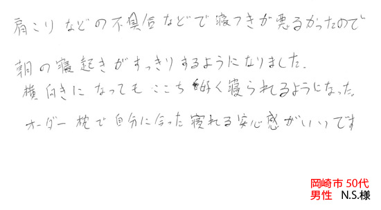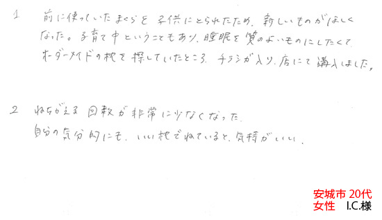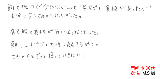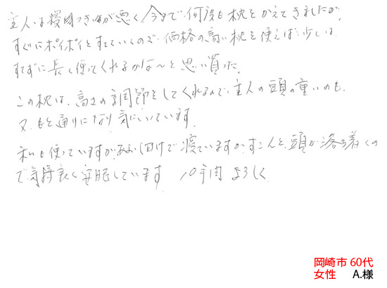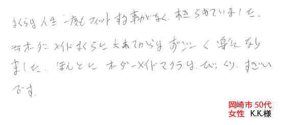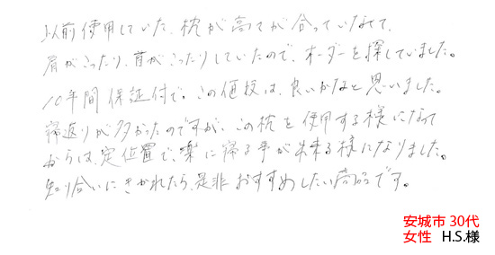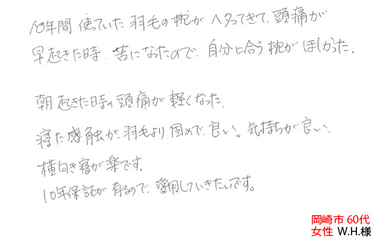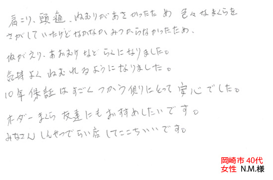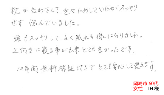 そう思われるのもムリありません。事実枕でお悩みのお客様はとても多いのです。そんな あなたのために、当店のオーダーメイド枕を実際にご使用頂いているお客様の声をお聞きください。